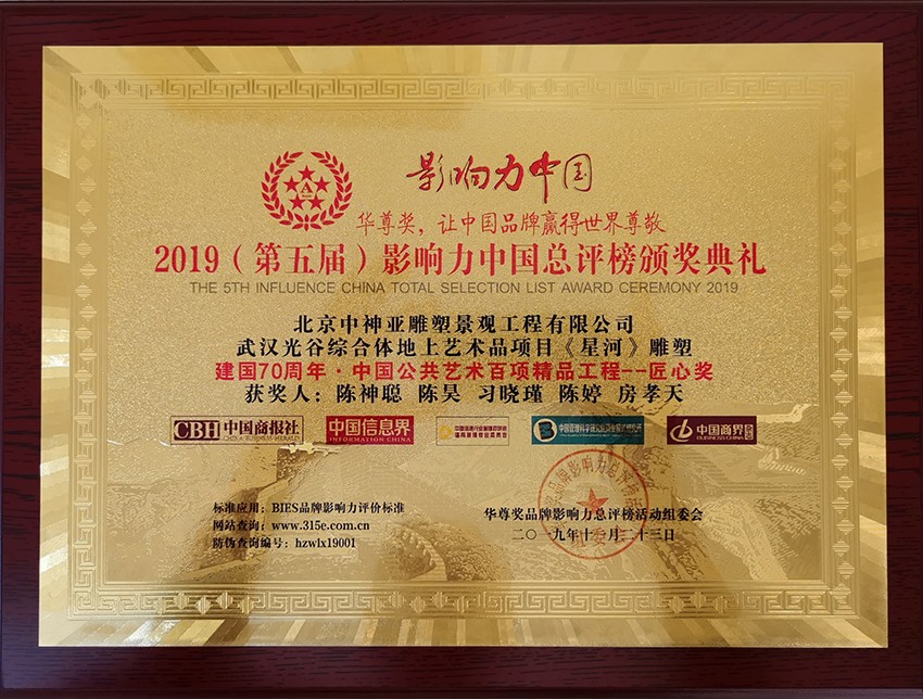 中神亞公司匠心打造的武漢光谷綜合體地上藝術品項目《星河》雕塑,榮膺建國70周年-中國公共藝術百項精品工程--匠心獎,同時中神亞創始人陳神聰董事長榮膺新時代-最美奮斗者榮譽稱號。